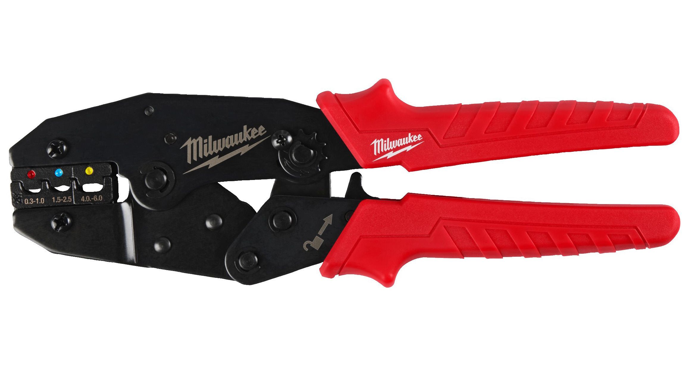 - 3 krimpelő nyílás, amelyekkel egyetlen szerszámmal többféle méretű csatlakozó krimpelhető: piros (0,3 - 1,0 mm²), kék (1,5 - 2,5 mm²) és sárga (4,0 - 6,0 mm²).